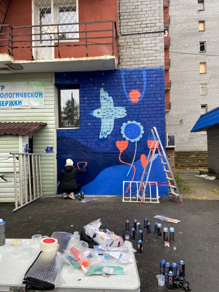 В рамках фестиваля «Добрые Зори» стрит-арт команда города создала благотворительный мурал «Добрая ночь»: полярная ночь, светлая поляна цветов и парящая над ними полярная сова в мягких, округлых линиях символизируют заботу, гармонию и поддержку.