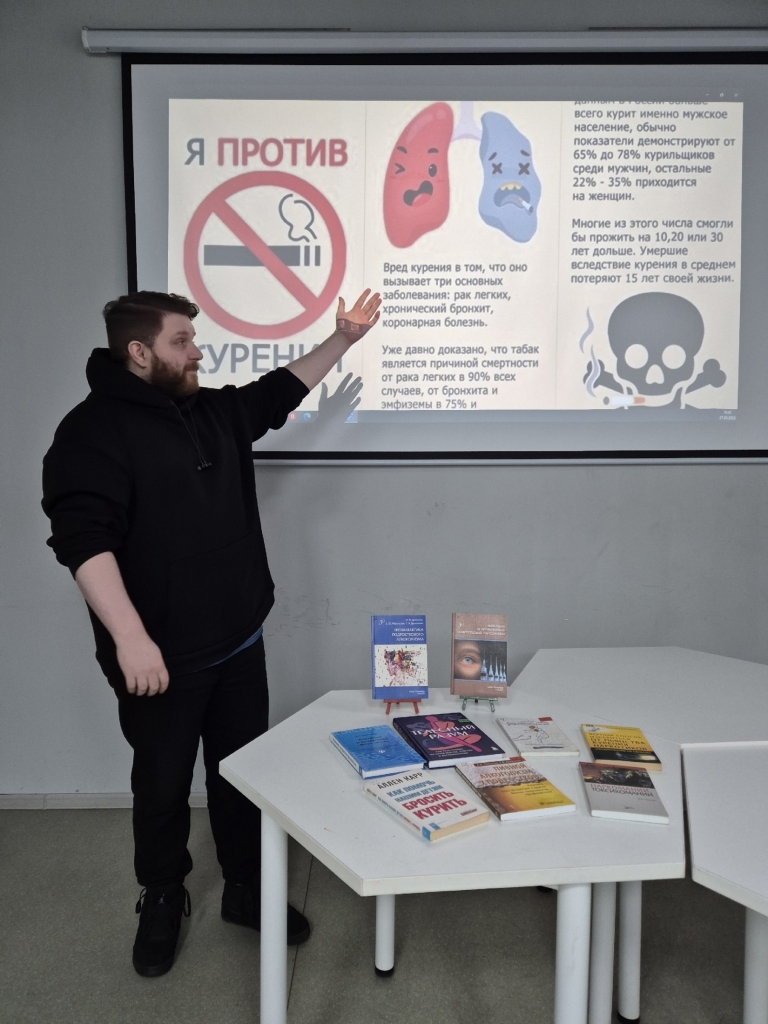 Мы рассказали посетителям о том, как курение вредит здоровью, затрагивая различные системы организма, а особенно в юношеском возрасте. Полезной альтернативой являются разнообразные виды спорта, формирующие красивое тело, целеустремленность и силу духа.