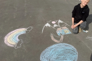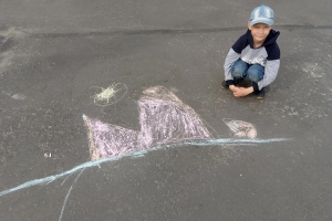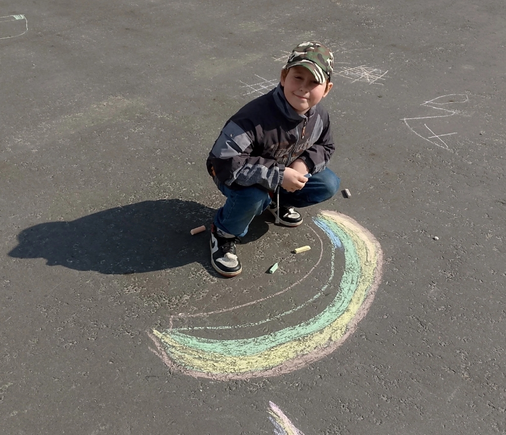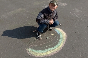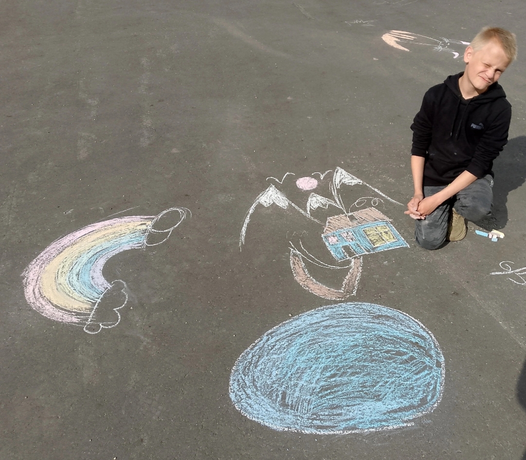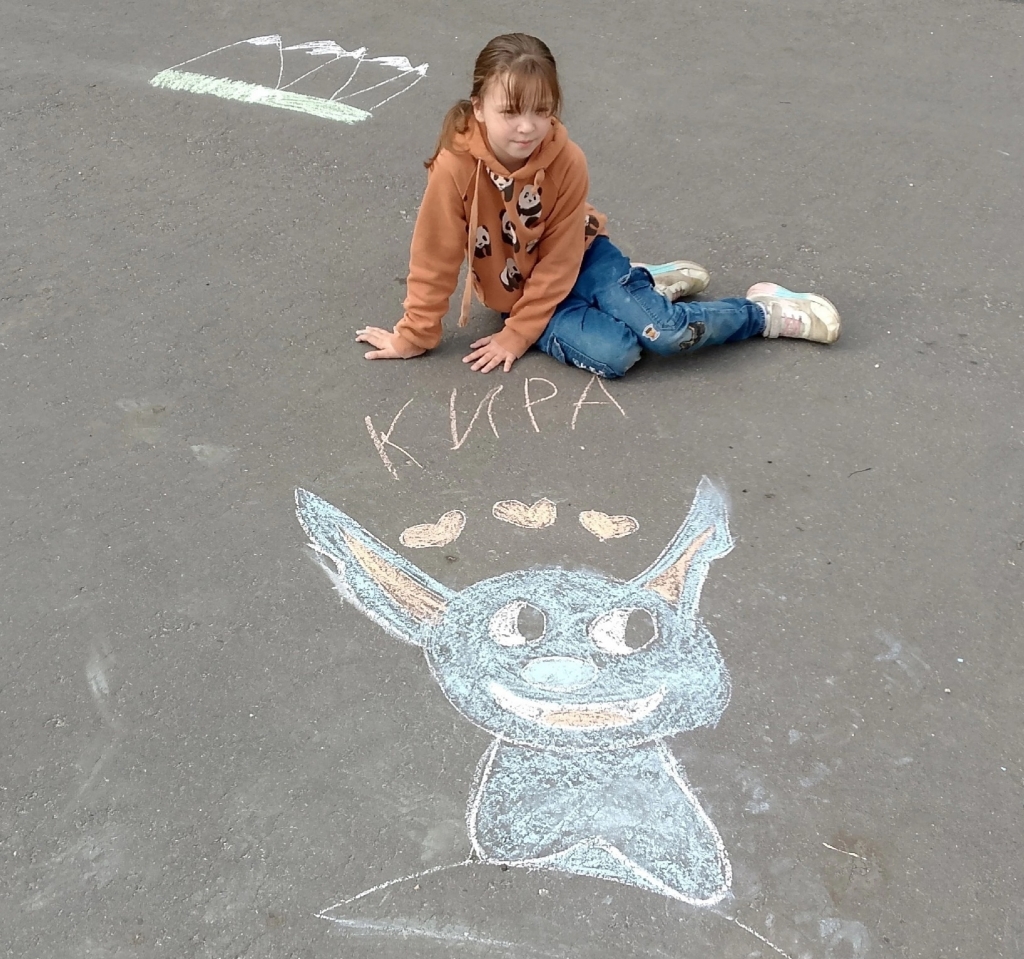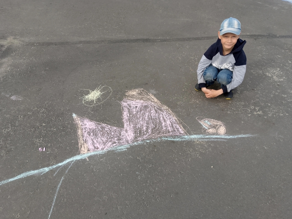 Ребята с большим удовольствием, применяя свои творческие способности, создавали различные картины, в которых сумели отобразить задуманное. На асфальте расцветали удивительные цветы, сверкала красочная радуга, взметнулись в высь горы, разлилась быстрая река со сказочными деревьями.
